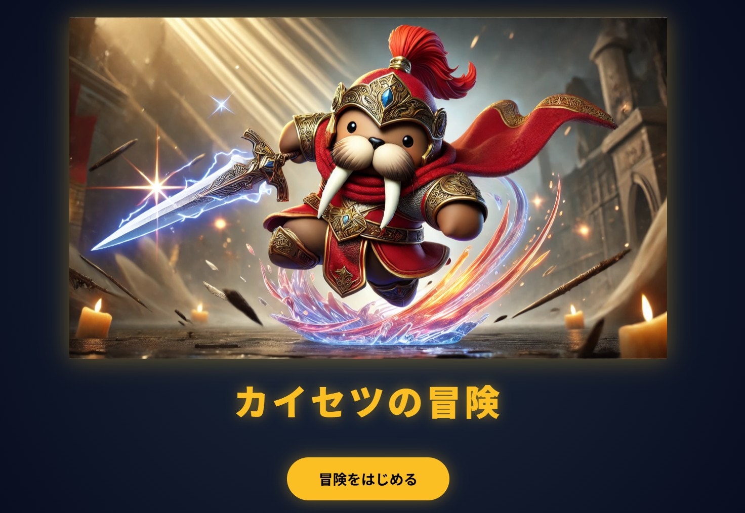 我が家のマスコットキャラクター『セイウチのカイセツ』が勇敢な戦士姿となって登場し、これから始まる冒険のワクワク感を演出してくれています。