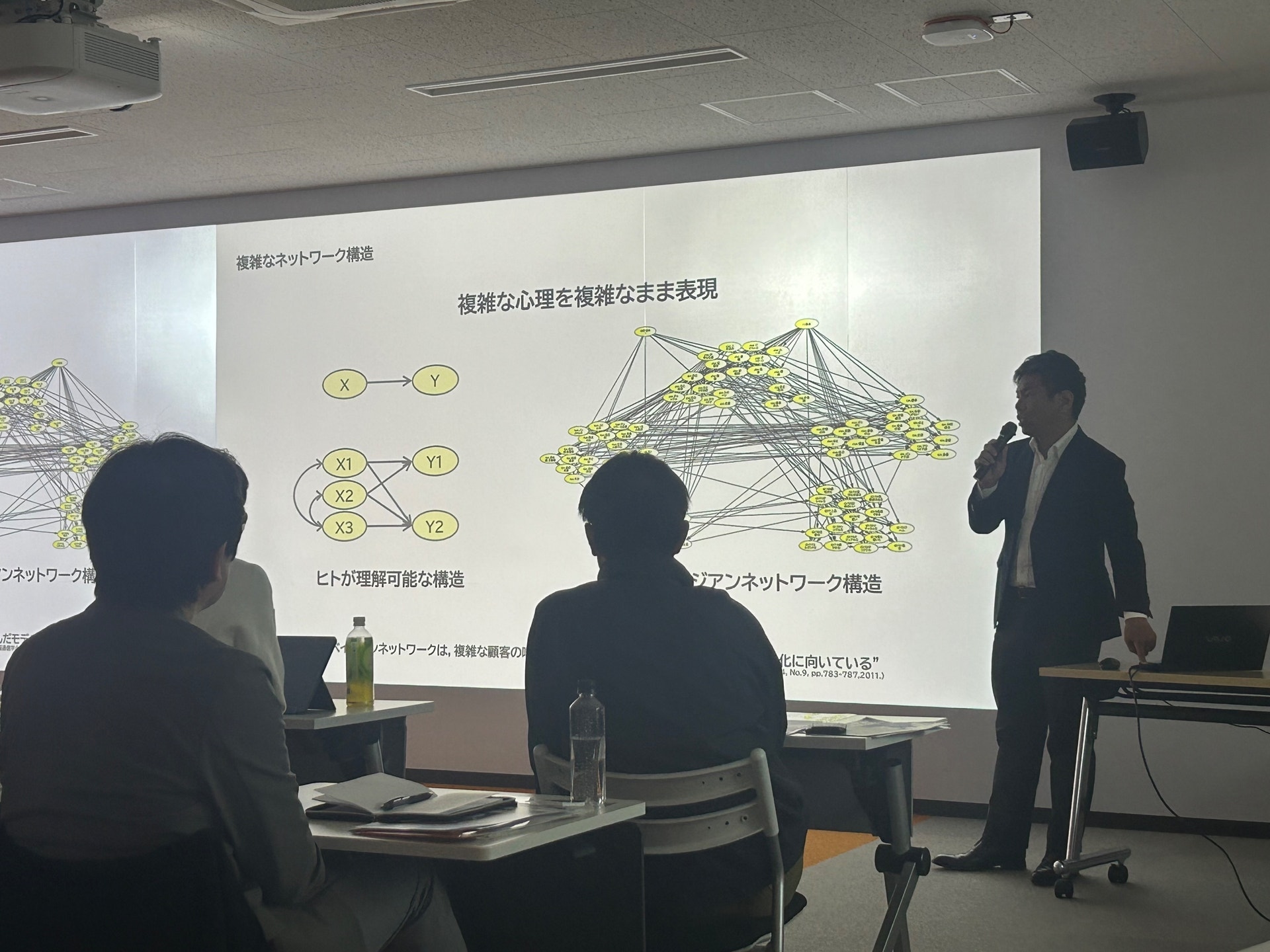 要因間の因果的関係を可視化した、共起ネットワークとベイジアンネットワークの可視化結果を読み解くワークが実施された。遅刻で加わらず。