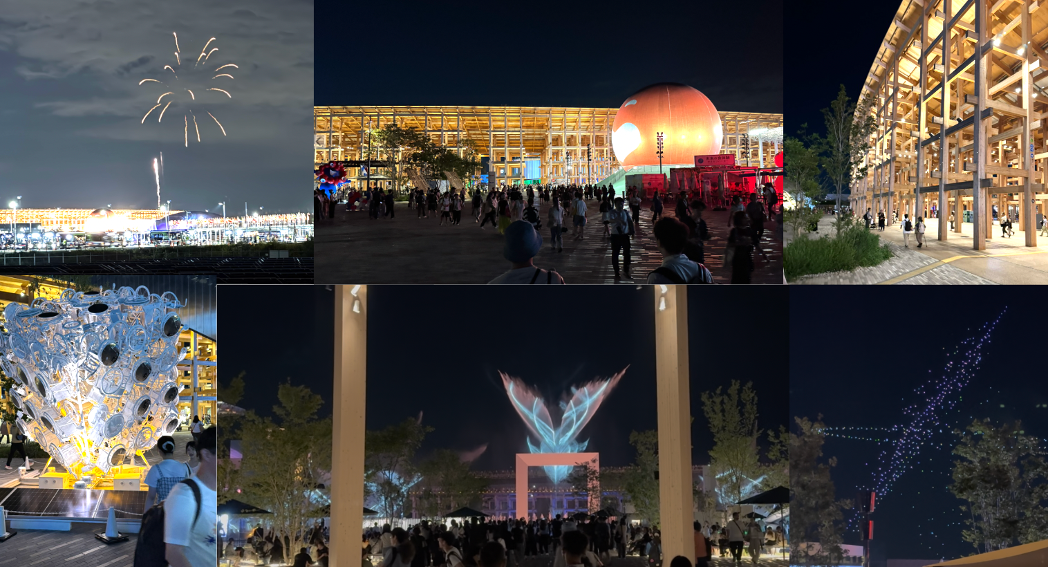片付けが終わった後、夜の万博をみんなで楽しみました。空いているパビリオンやお土産屋さん巡り、花火、噴水ショー、ドローンショーと最後まで見どころ盛りだくさんでした。夜になると日中に比べてかなり涼しくなりました。