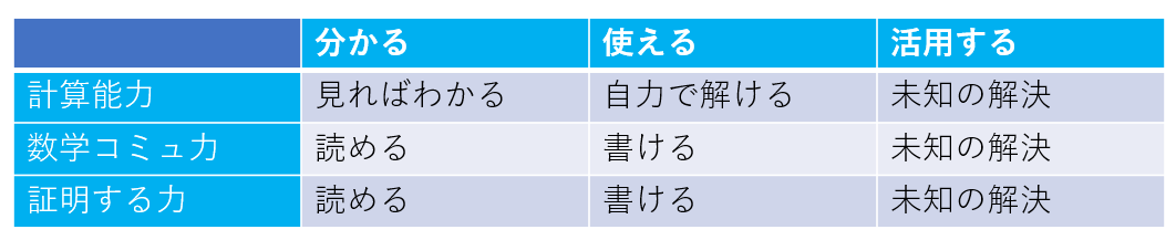 "使える"とは、問題が与えられた場合、適切に計算したり、適切な数学コミュニケーションや証明の力を用いて、解決する力です。英語でいうと、"ライティング・スピーキング"の力ですね。