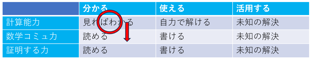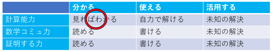 "分かる"とは、計算であれば、既に与えられている結果・答え、数学コミュニケーションや証明であれば、書かれている内容について理解できることです。英語でいうと、"リーディング・リスニング"の能力ですね。
