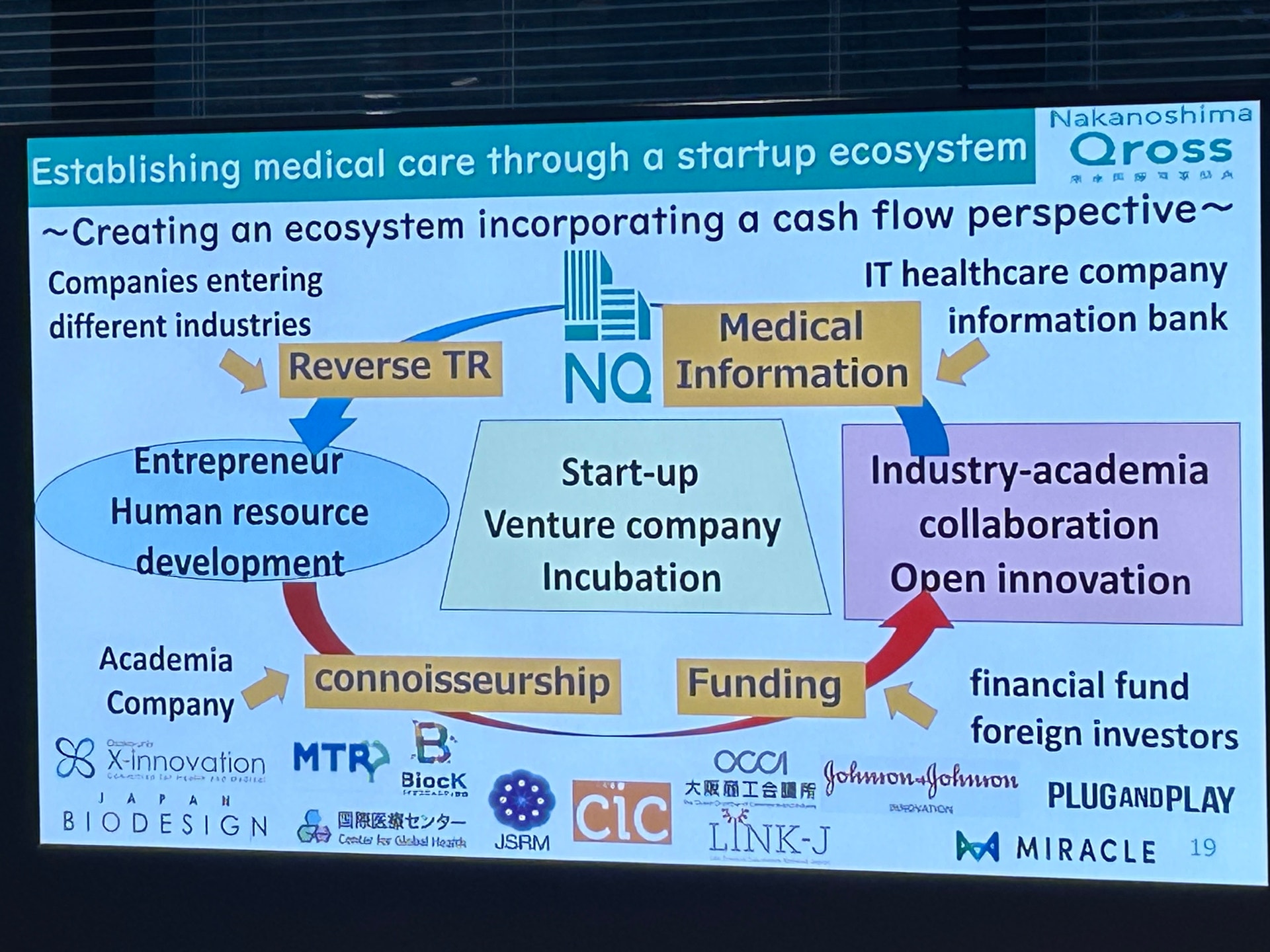 ご挨拶、Nakanoshima Qrossのご紹介として、澤芳樹先生(一般財団法人未来医療推進機構 理事長、LINK-J副理事長)より、ヘルスケアスタートアアップの展開、支援、グローバルネットワーキングでの実例、現状、将来の可能性など、貴重なお話を伺うことができました。