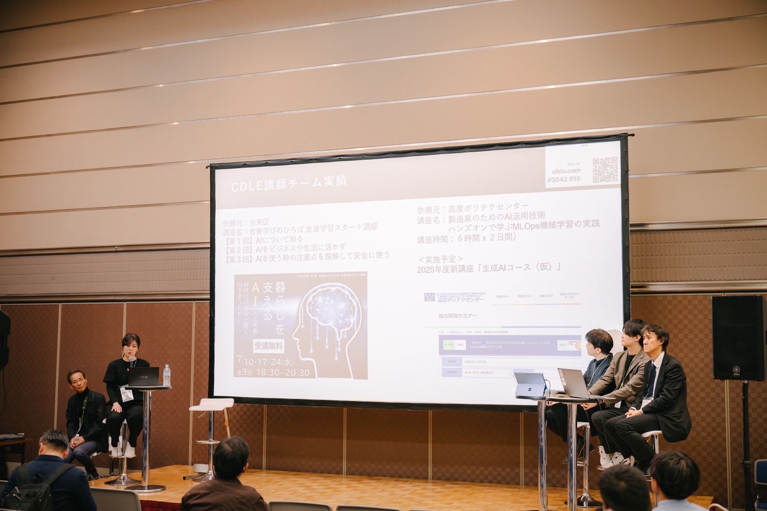 CDLEパートでは、資格を取得した人たちのその後の活かし方をテーマにパネルディスカッションを行いました。転職やキャリアアップの話や講師として外部へAIのノウハウを伝える話など、日頃働く中では聞けない興味深い話をたくさん聞くことができました。